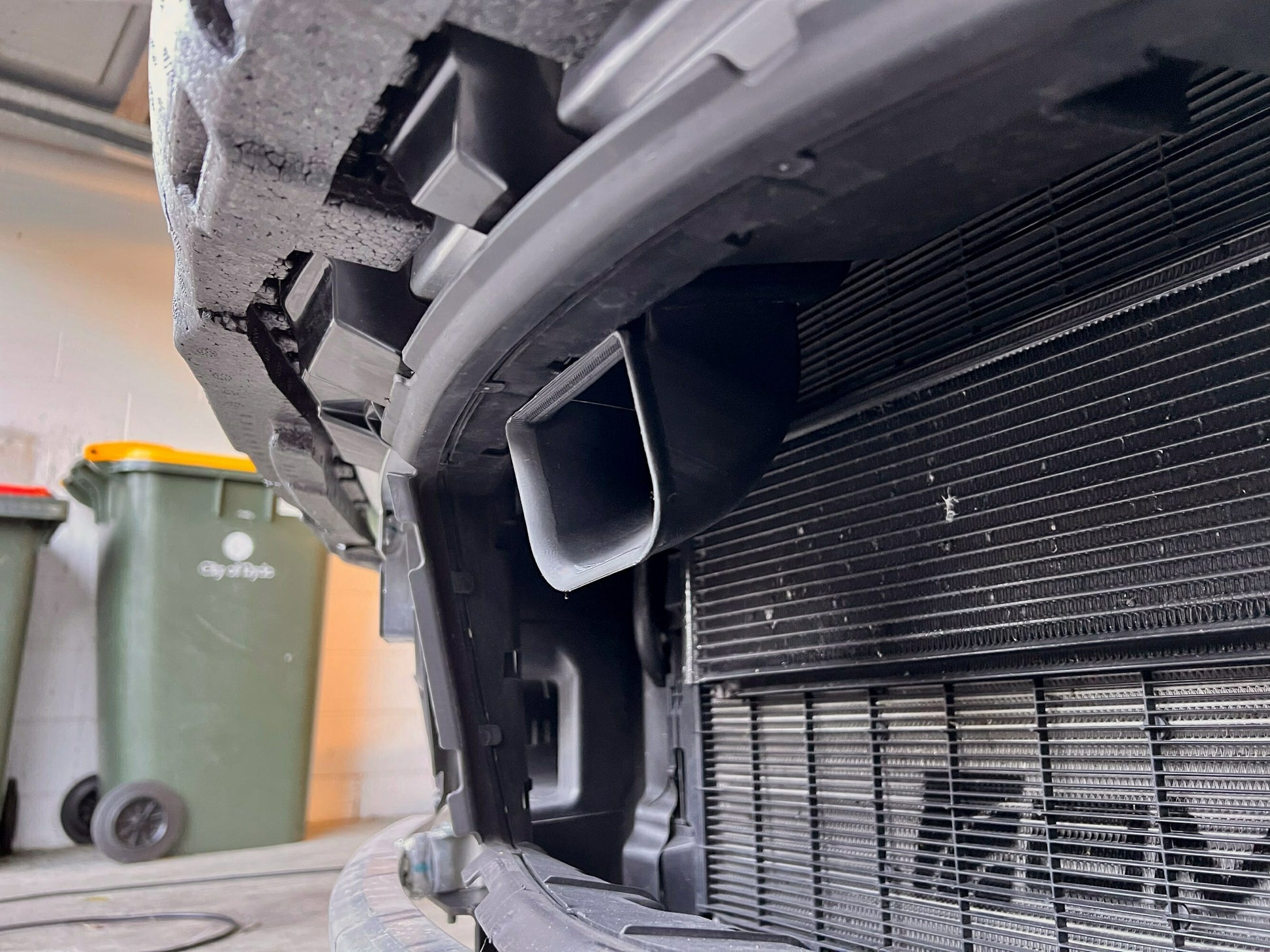 This Cold Air Intake (CAI) duct feeds the airbox with unimpeded fresh air sourced from the middle radiator grille. This exact part helps the DNA Autosport WTAC Supra to run consecutive 700whp laps without heat soak (in conjunction with other cooling upgrades.)